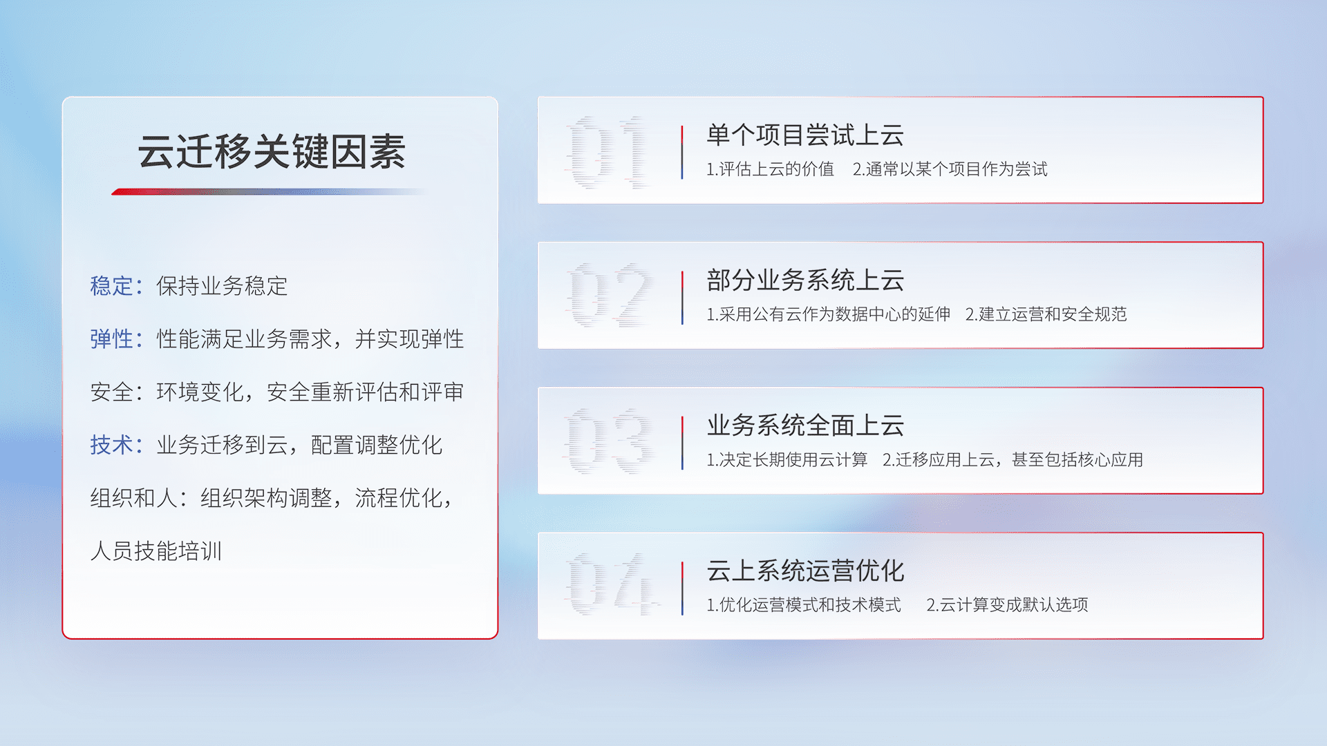 结合实际业务,,从规划设计、、、云平台选型、、、云原生改造、、、、数据迁移、、、集成交付,,迁移全过程为客户识别最佳上云路径,,,,做好风险识别管理,,,,设计网络架构、、、身份权限、、、安全审计合规、、操作审计、、日志审计、、、监控告警策略、、、、多站点容灾设计等,,,对云上基础设施进行整体规划,,,提升IT治理水平,,,,以满足弹性、、高可用、、、、高性能的需求。。。。